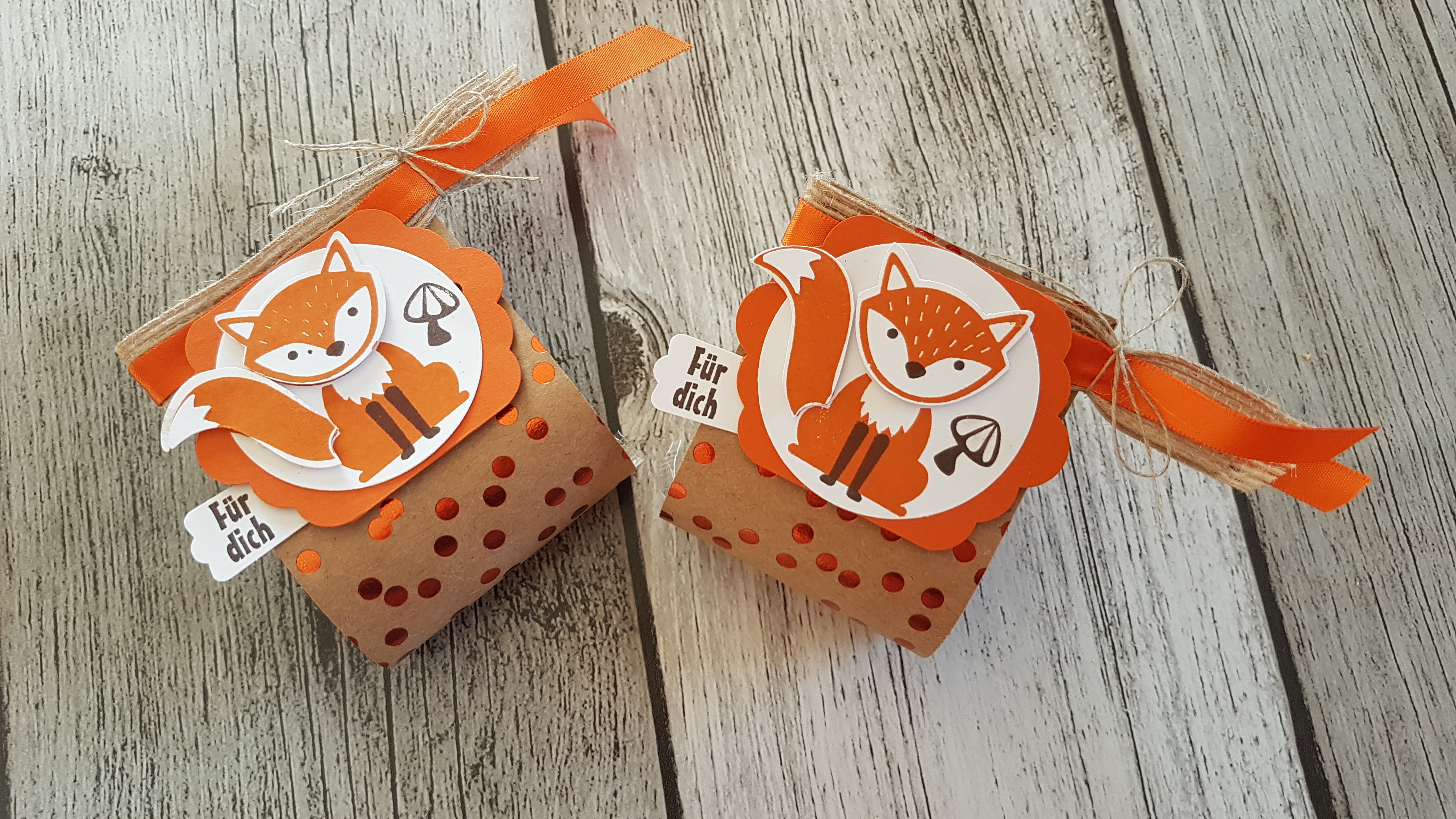 Zu diesem Two-Step-Klarsicht-Stempelset gehört auch noch diese tolle Elementstanze Fuchs aus dem aktuellen Jahreskatalog. Damit habe ich z.B. den Kopf und die Schwanzspitze ausgestanzt und für die beiden eingetütet.