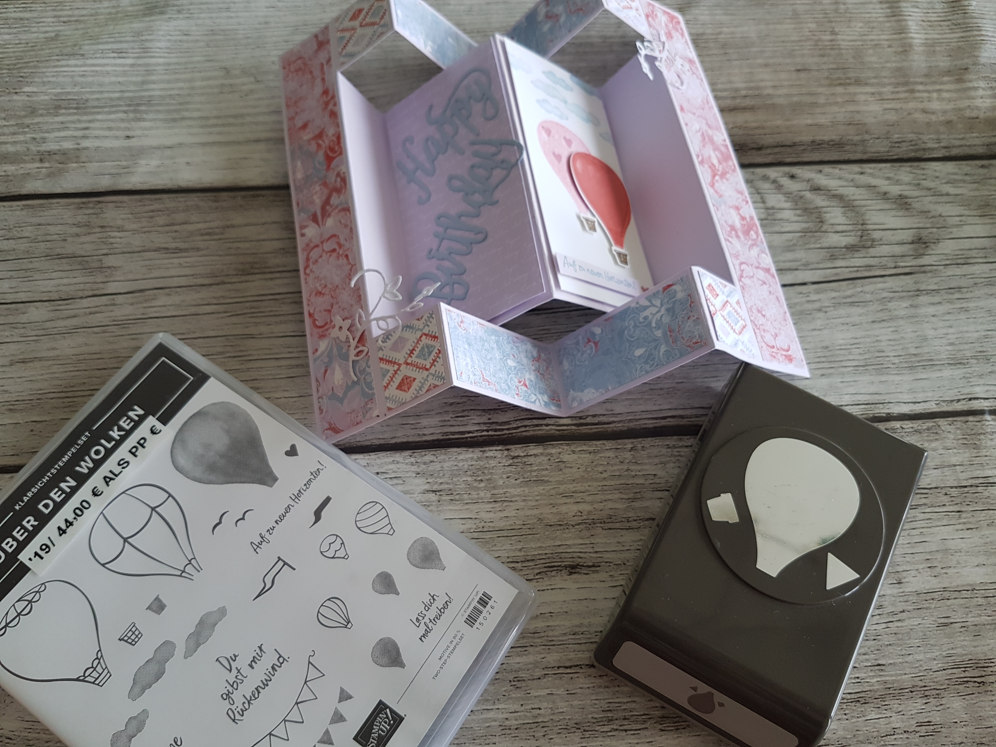 - Aufstell-Karte mit besonderer Falttechnik mit dem Stempelset „Über den Wolken“ und der passenden Handstanze „Heissluftballon“. Designerpapier