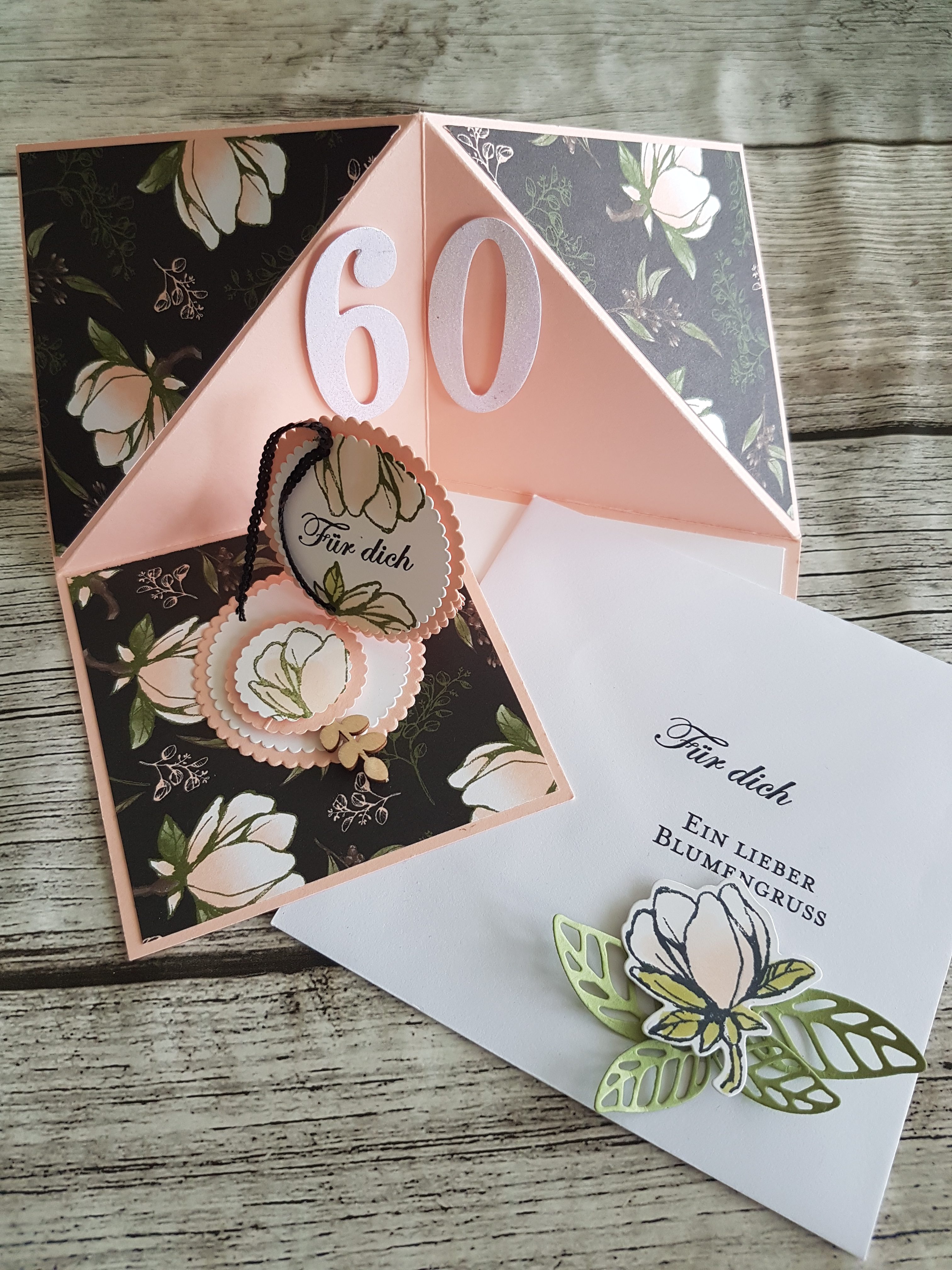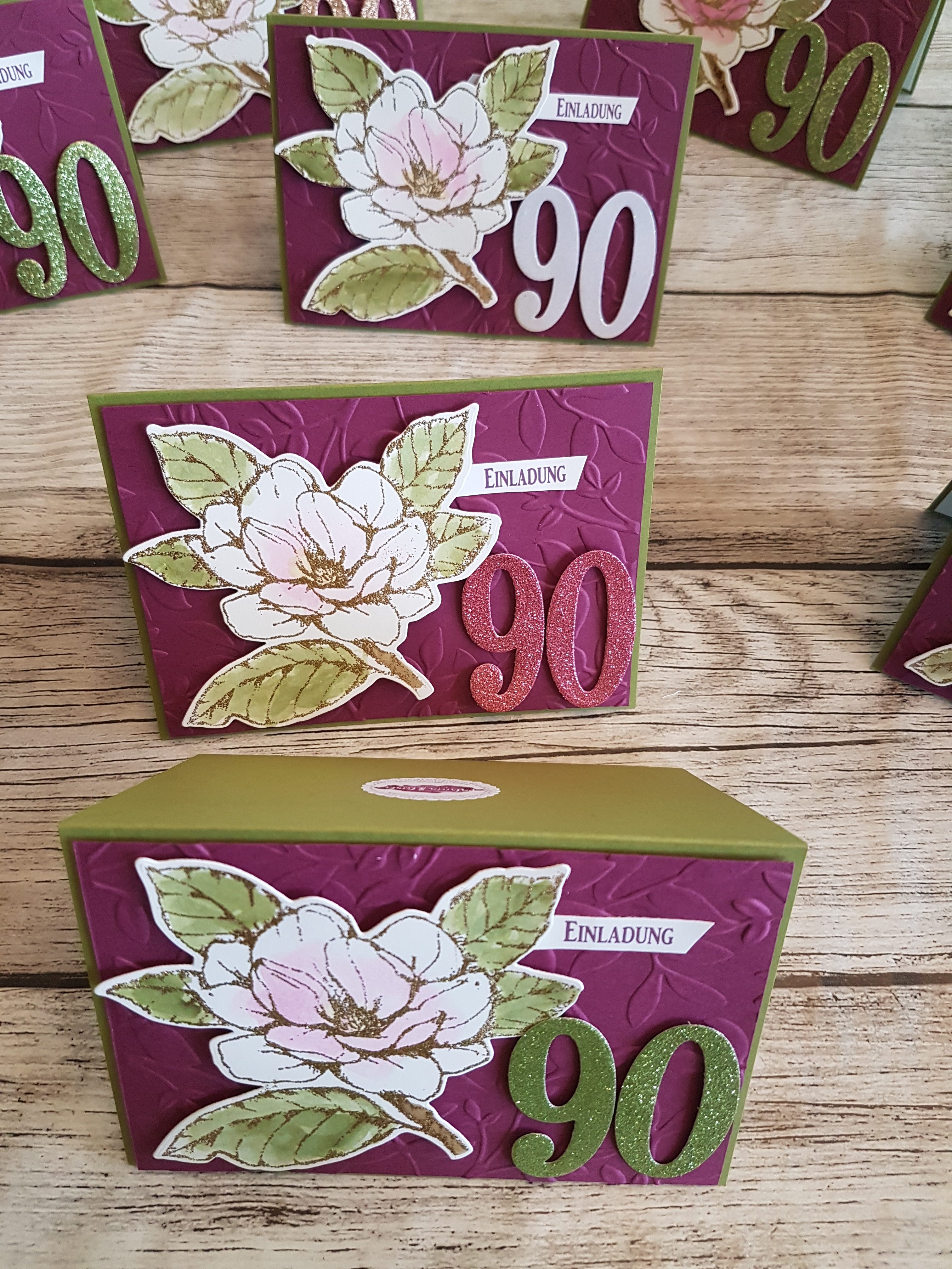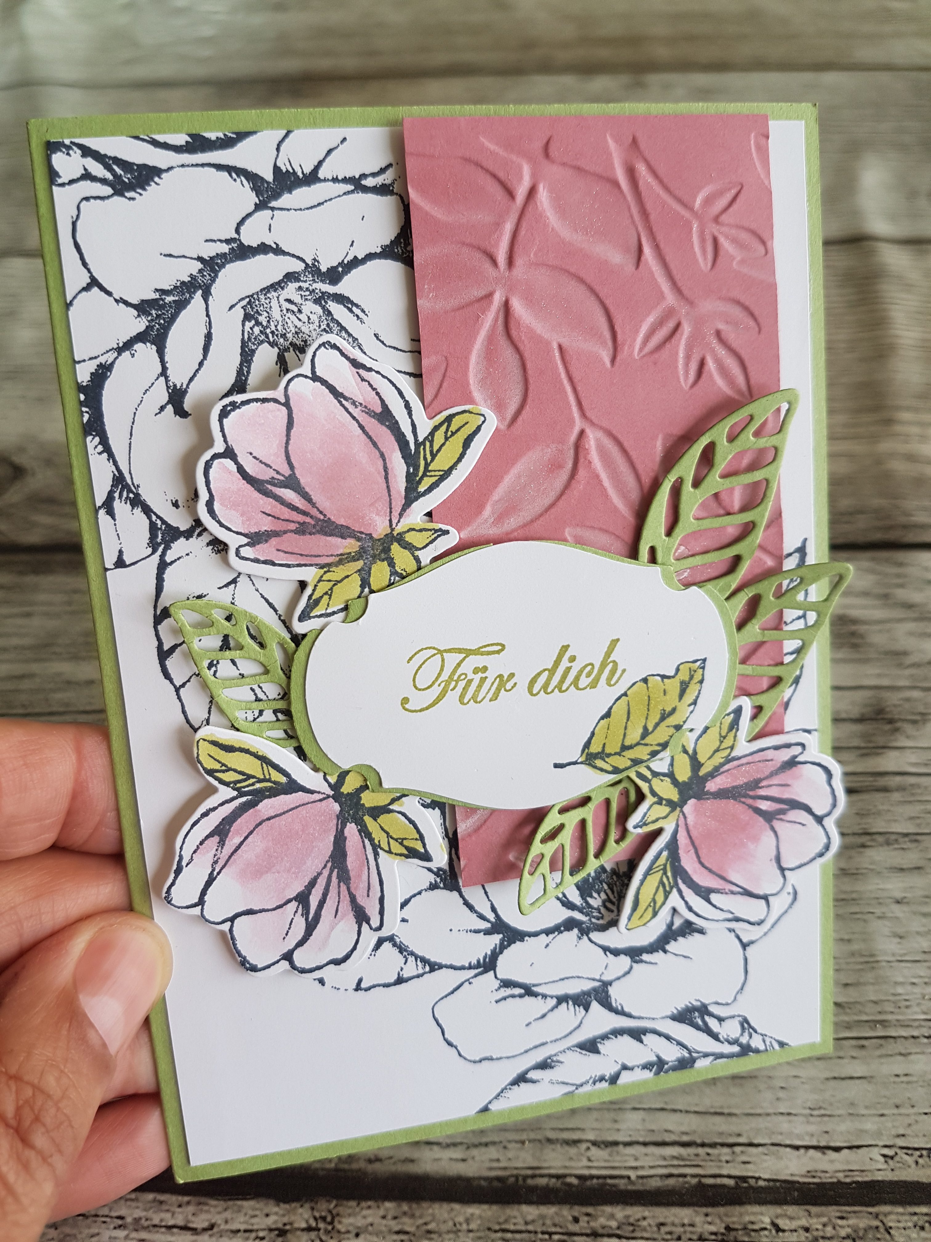 Wie Ihr seht, bin ich ganz verliebt in das Produktpaket Magnoliengruss. Das ist aber auch zu schön. Ich habe daher beinahe die ganze Produktreihe bei meinen Aufträgen verwendet, von den wunderschönen Stempeln wie der großen Magnolieblüte bis zu den Stanzformen, der 3-D Prägeform und natürlich dem wunderschönem Designerpapier.