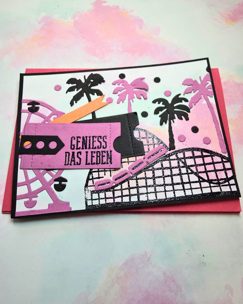 Auf meiner Karte wachsen die Palmen sozusagen direkt aus dem Rollercoaster am Pacific Pier. 🌴 🤣 Technisch habe ich alles auf die Karte gebracht, was das Produktpaket her gab. Stempeln, stanzen und embossen. ✂📏🖌🎨