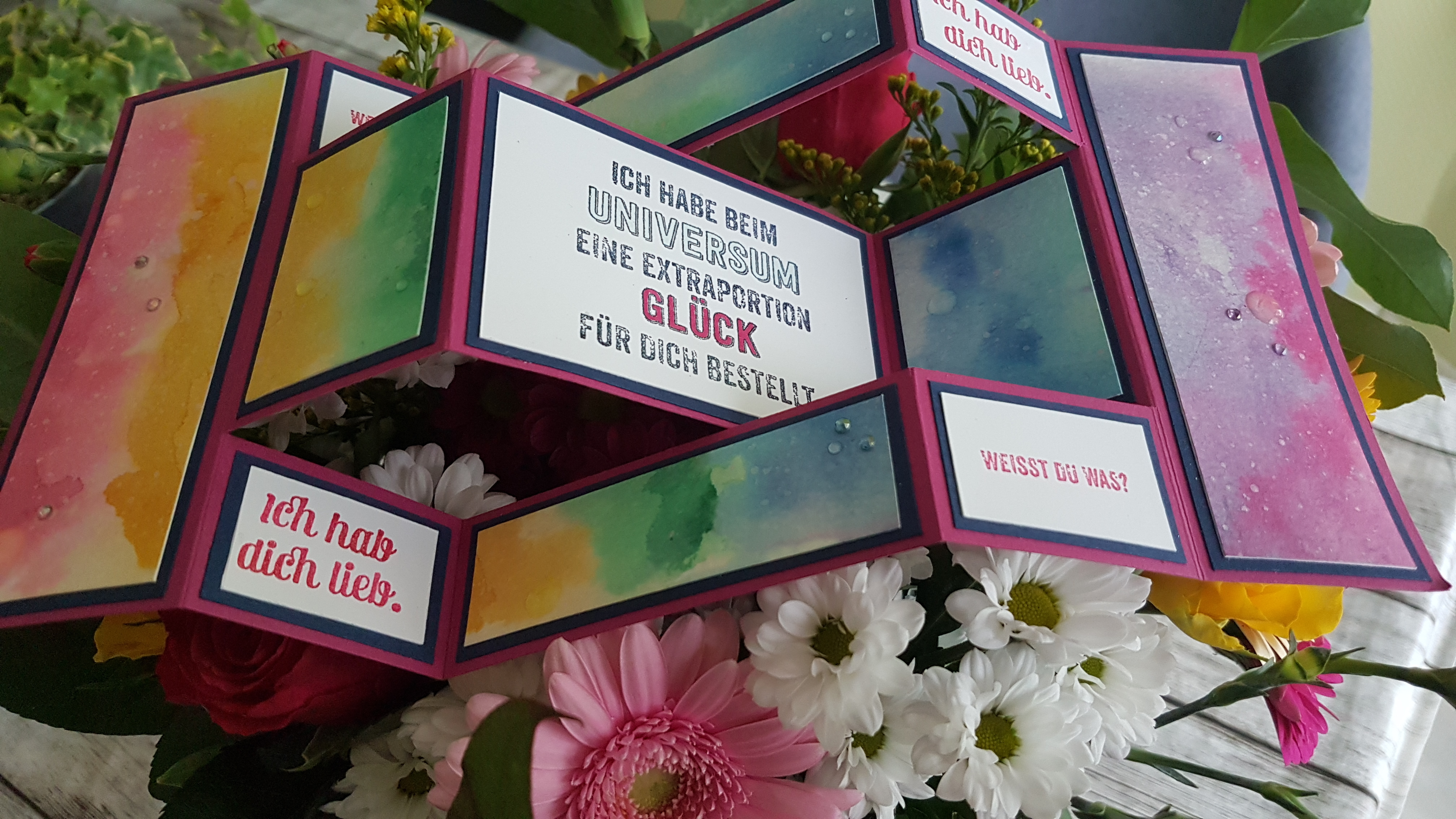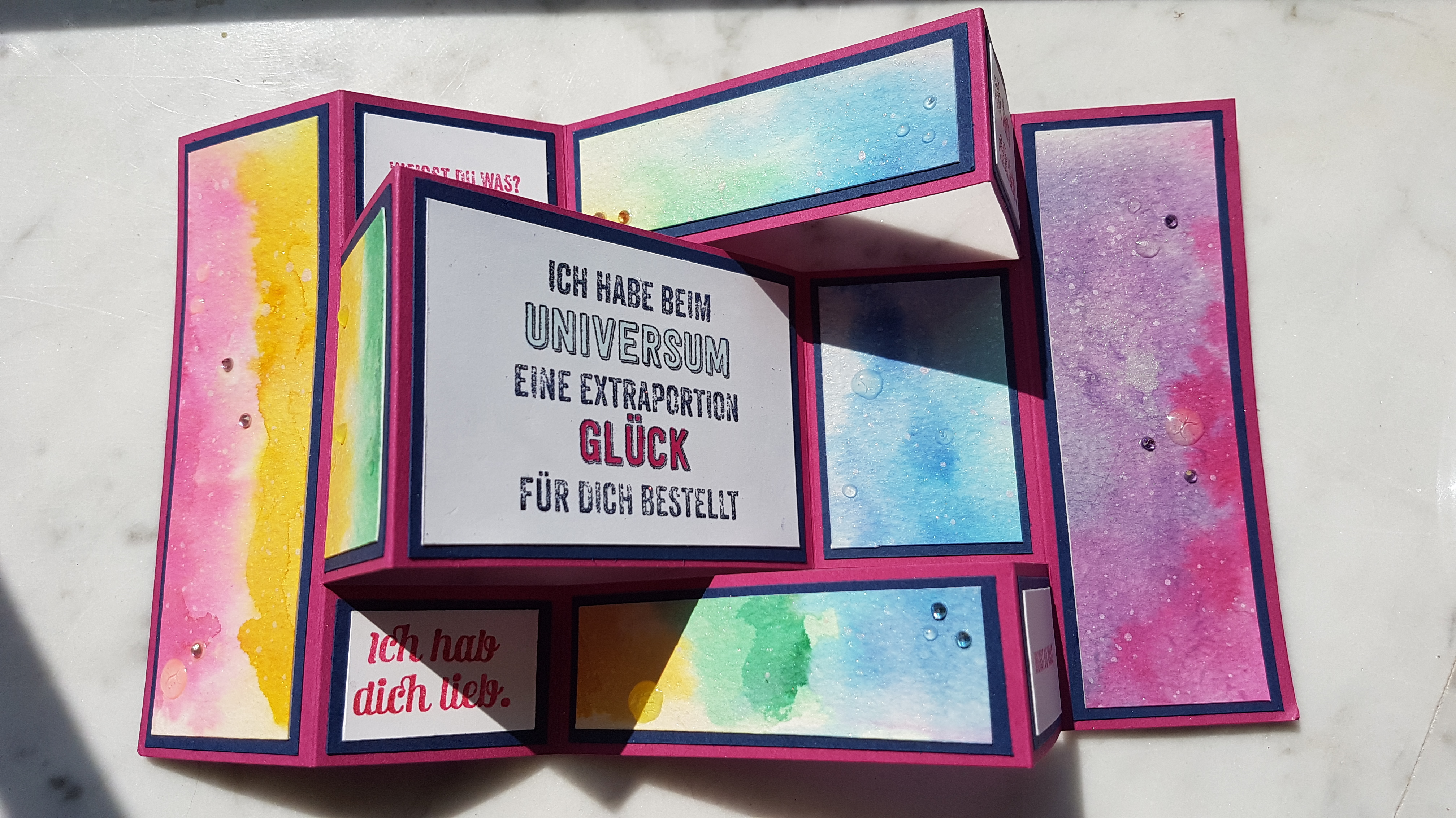 Mein Göttergatte kam am 29.04.19 von seiner REHA (nach einer Knie-OP) zurück und da wollte ich ihn mit dieser aufmunternden Karte ganz herzlich wieder zu Hause begrüßen. Ich liebe es ja bunt und somit kam mir die Idee ein schön schillerndes Regenbogen-Universum zu gestalten. Die Karte kommt aufgestellt am Besten zur Geltung.