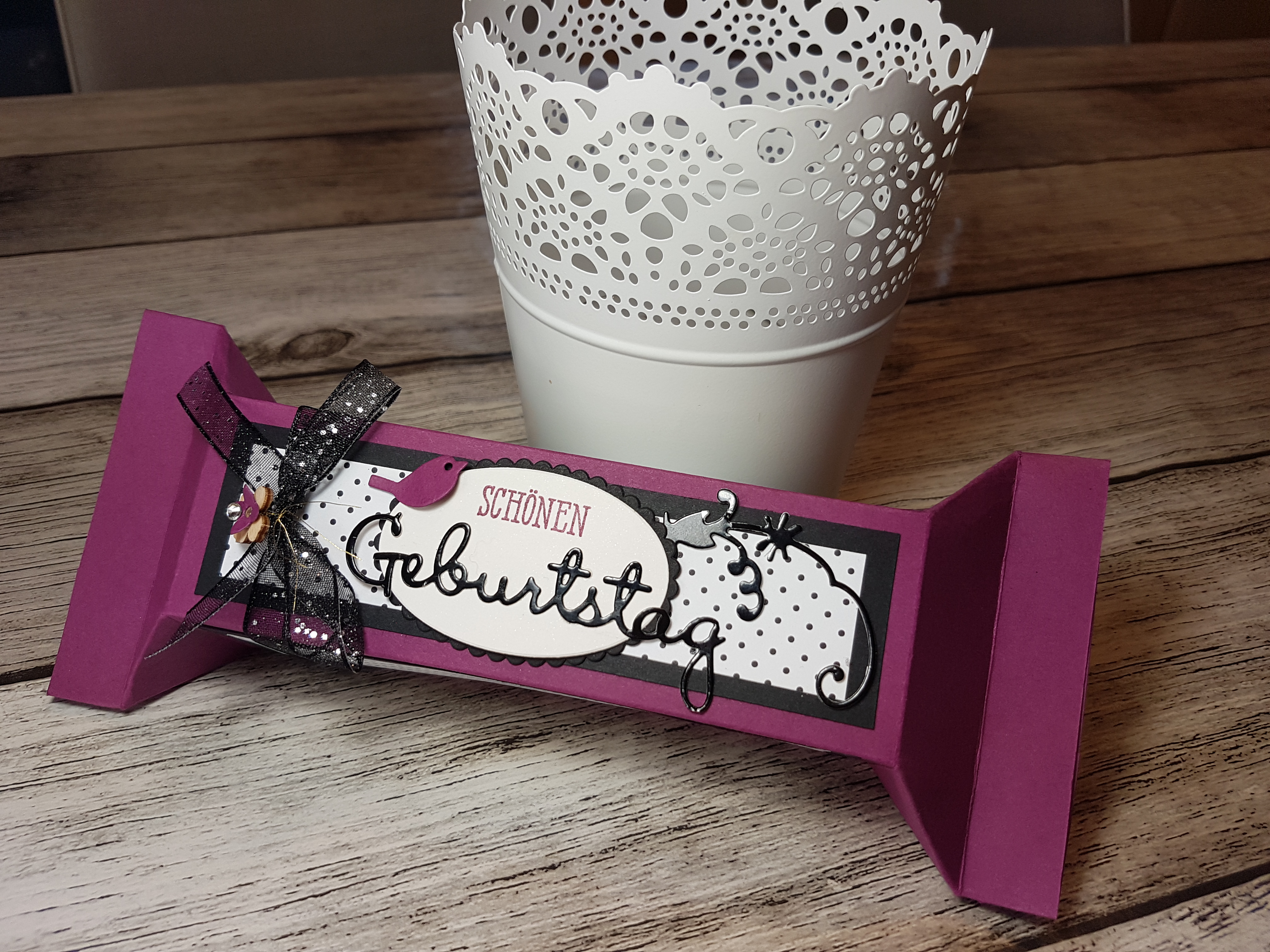 Die Anleitung für dieses große selbstschließende Knallbonbon, so nenne ich das mal, habe ich von Melanie von https://www.joystampin.de/ auf ihrem Blog gefunden. Danke für’s teilen, Melanie! Sie zeigt dazu auch ein Video und eine Anleitungs-Skizze. Perfekt zum Nachbasteln! Sharing is caring. Ich habe lediglich noch eine weitere Mattung unter das Designerpapier „Schmetterlingsvielfalt“ geklebt. Einfach 1/8 “ oder 0,5 cm größer als das Maß vom Designerpapier zuschneiden.
