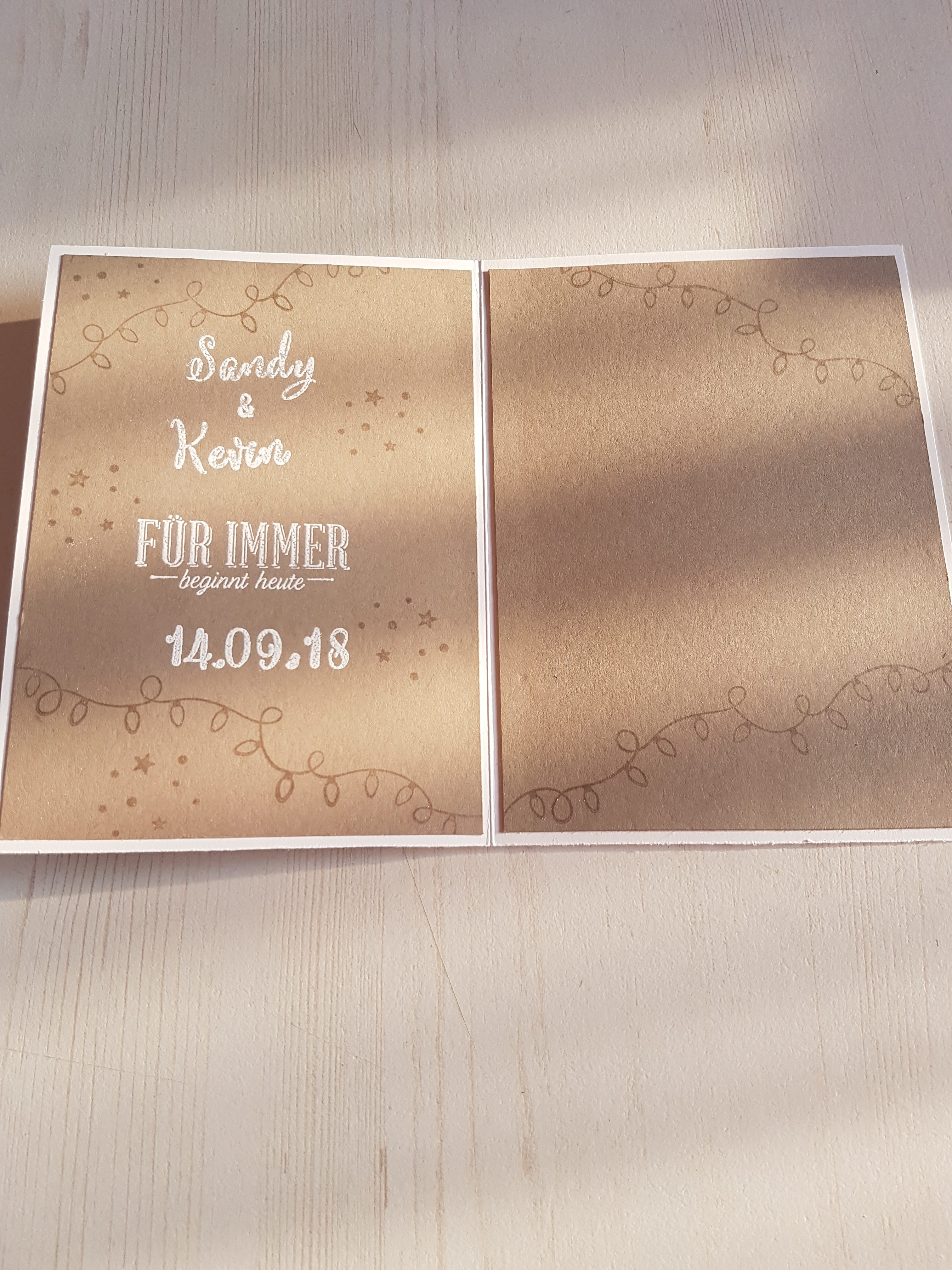 Diese schlichte, aber wie ich finde, dennoch sehr schöne personalisierte Karte habe ich für meine Freundin Anett S. im Auftrag gestalten dürfen. Wie ihr aus dem Datum ersehen könnt, ist sie bereits beim glücklichen Brautpaar angekommen und mit den besten Wünschen überreicht worden.