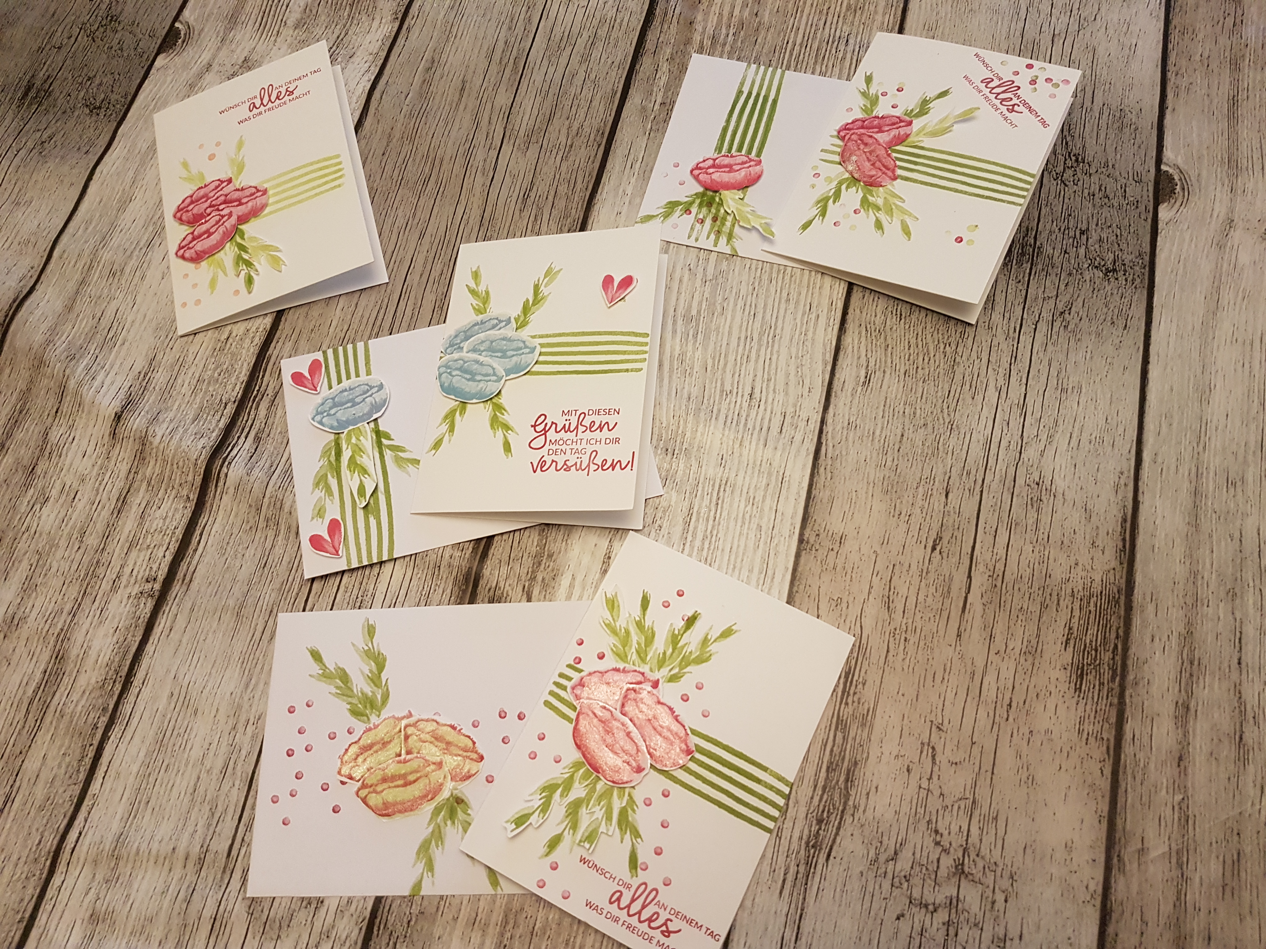 Toll, nä? Ich bin immer wieder überrascht, was für tolle Projekte beim ersten Stempeln entstehen. Alle benutzen das gleiche Stempelset, aber die Ergebnisse sind immer unterschiedlich/individuell.