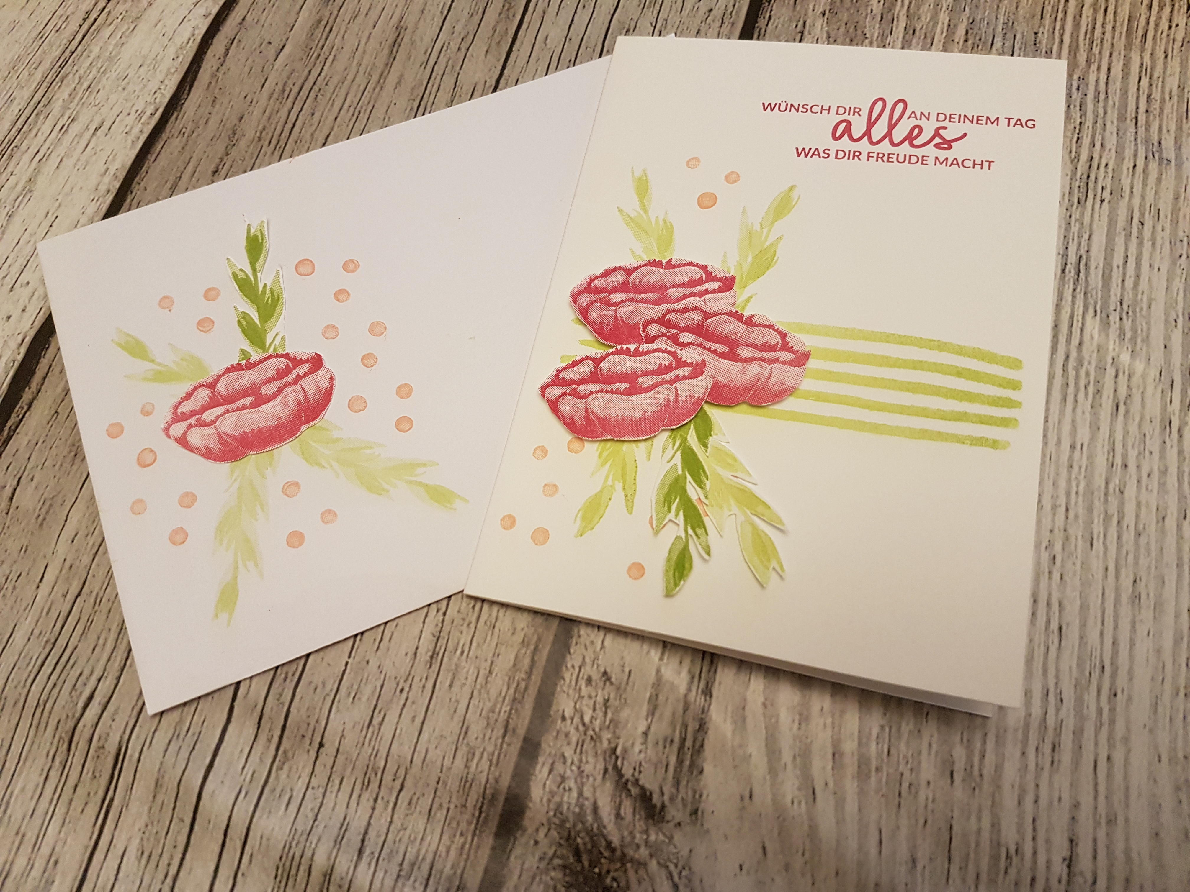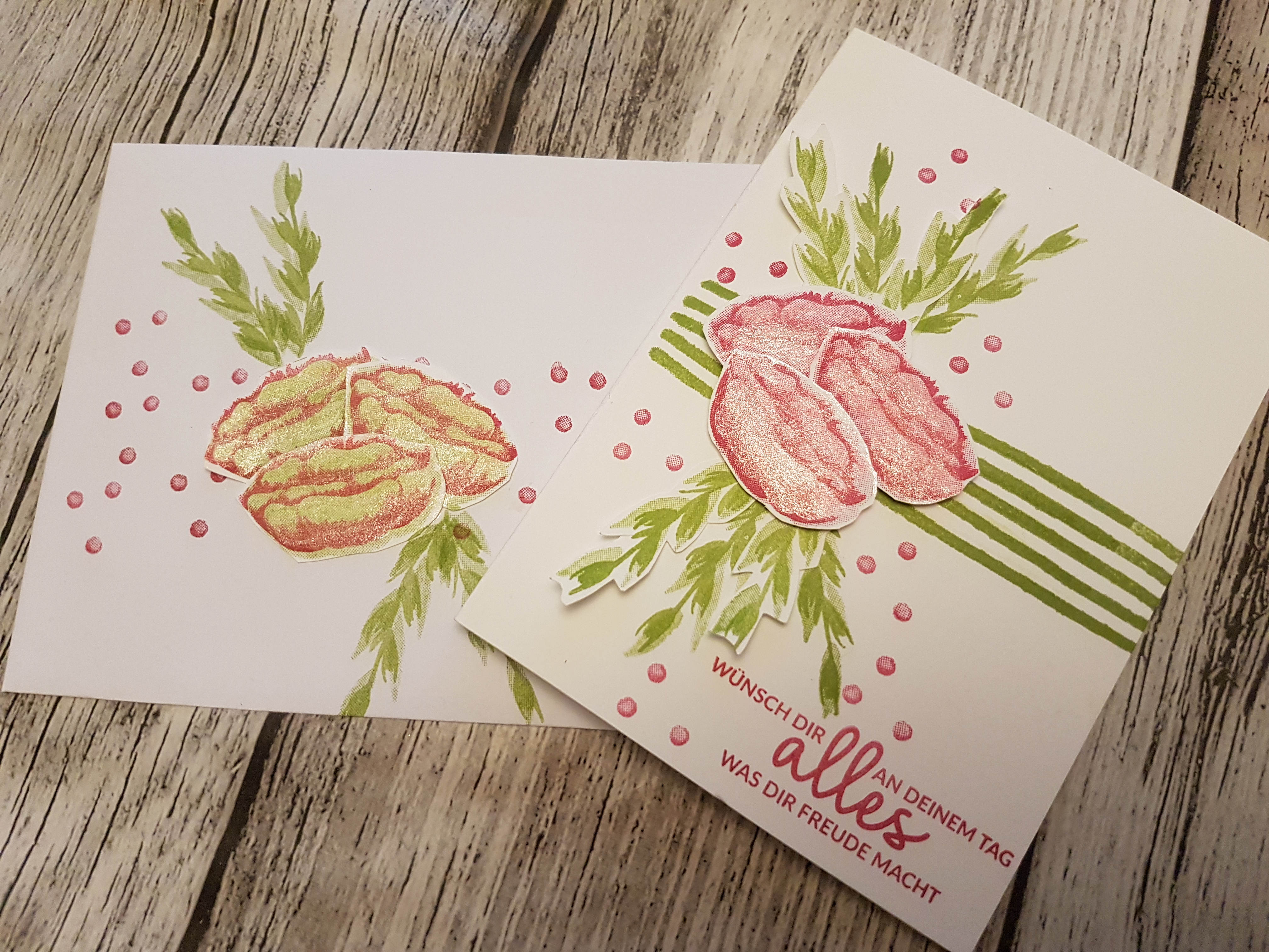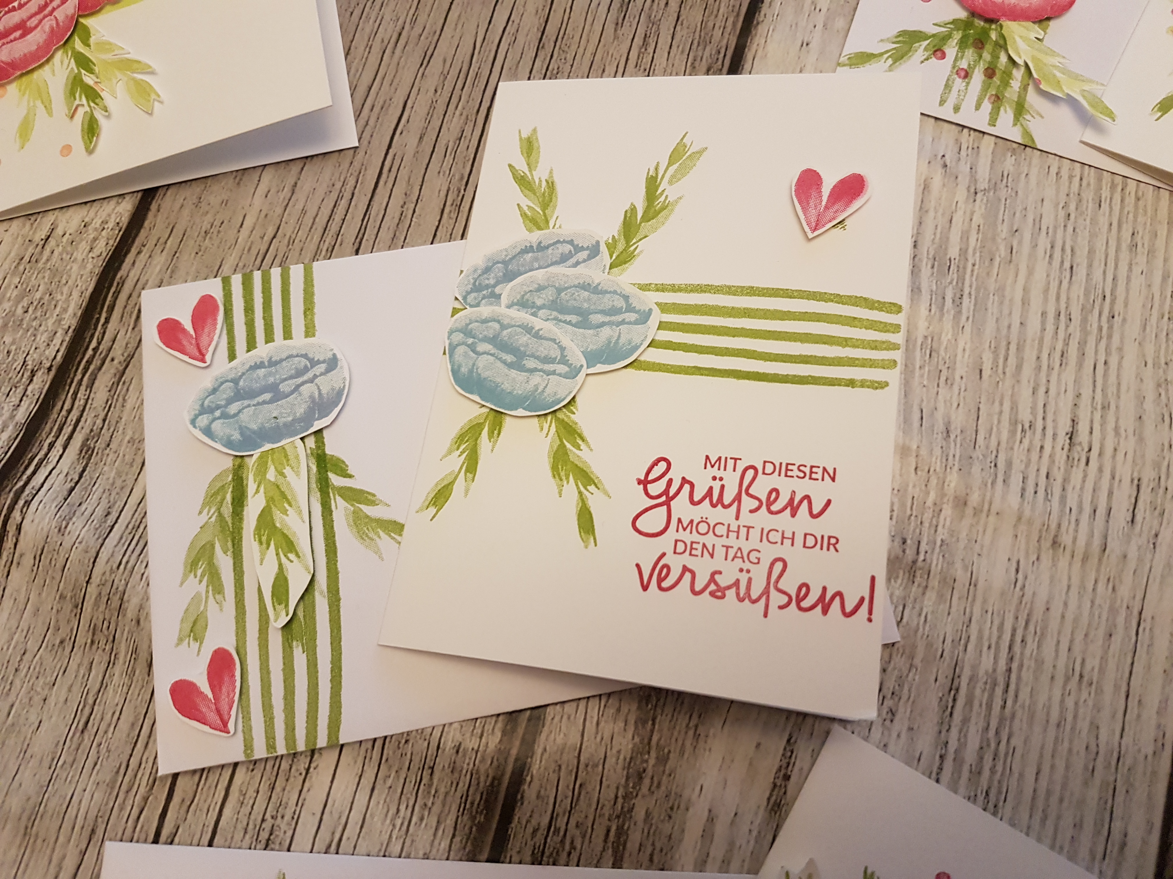 Nach einer Kaffe-und Kuchenpause, bei strahlendem Sonnenschein auf unserer Terrasse, gingen wir an das zweite Projekt; eine Grußkarte mit dem gleichen Stempelset.