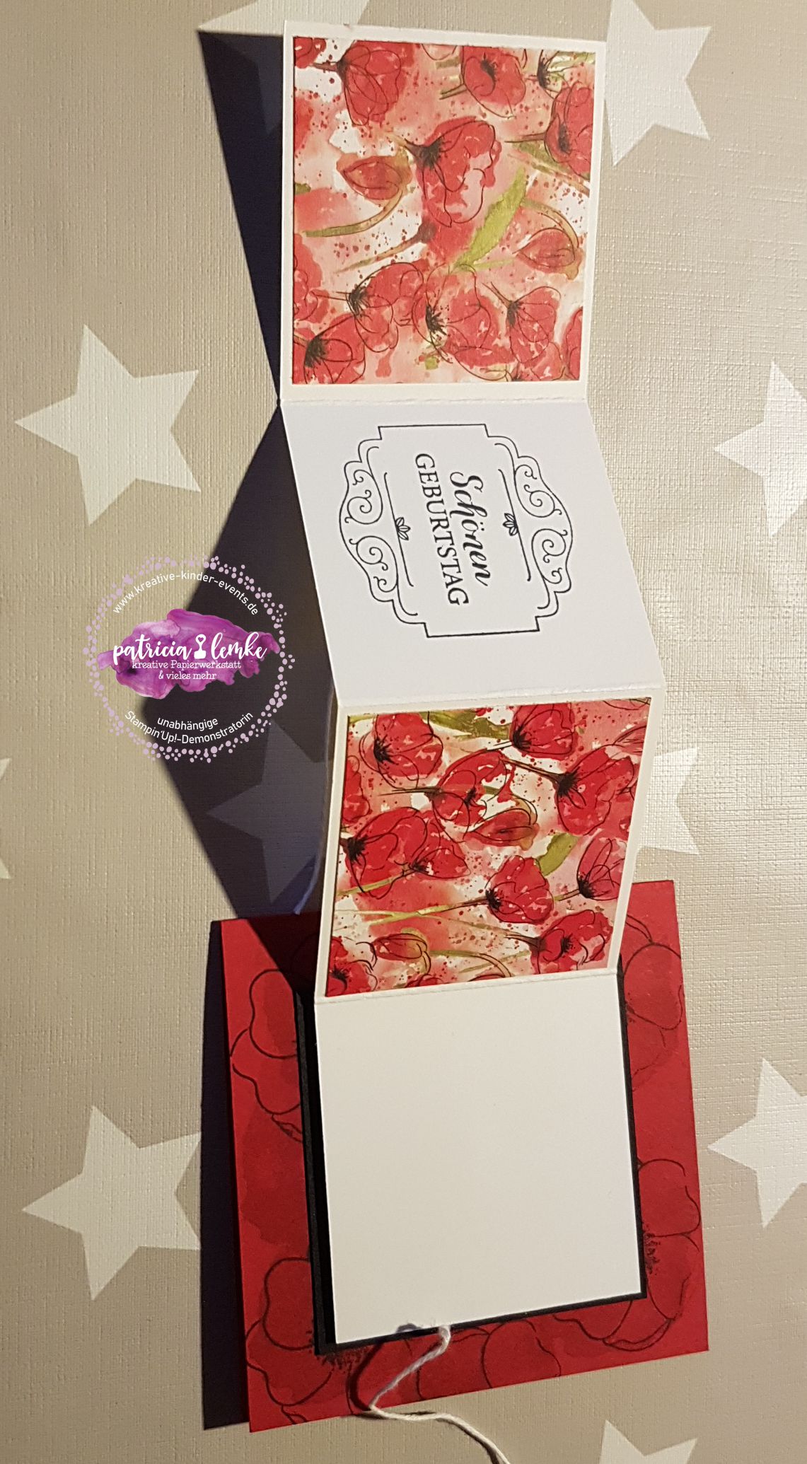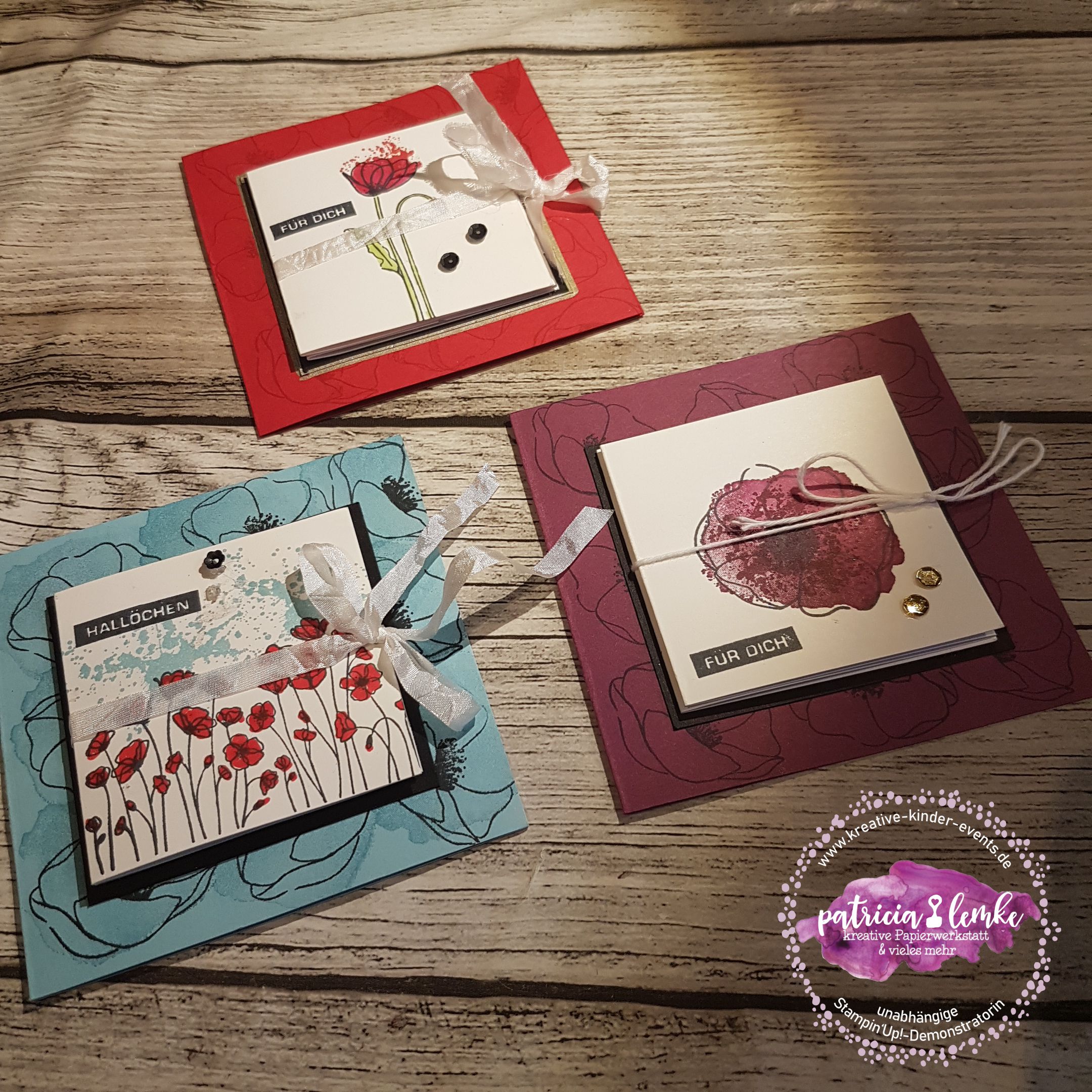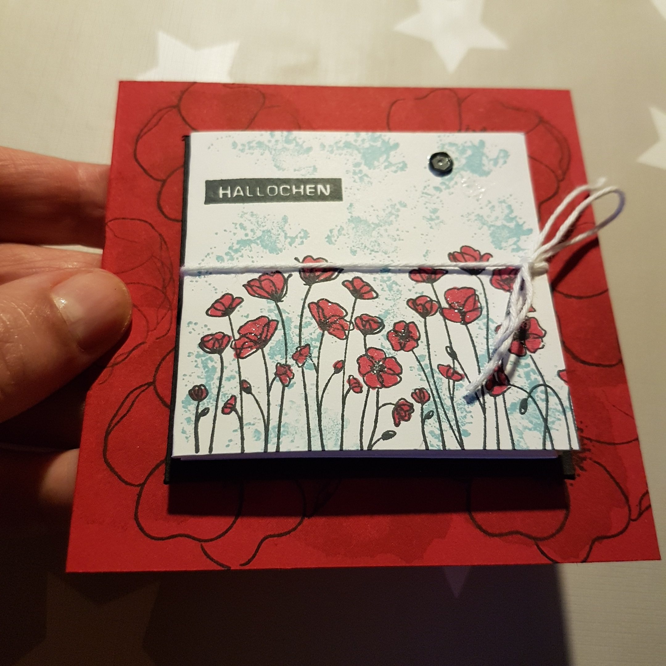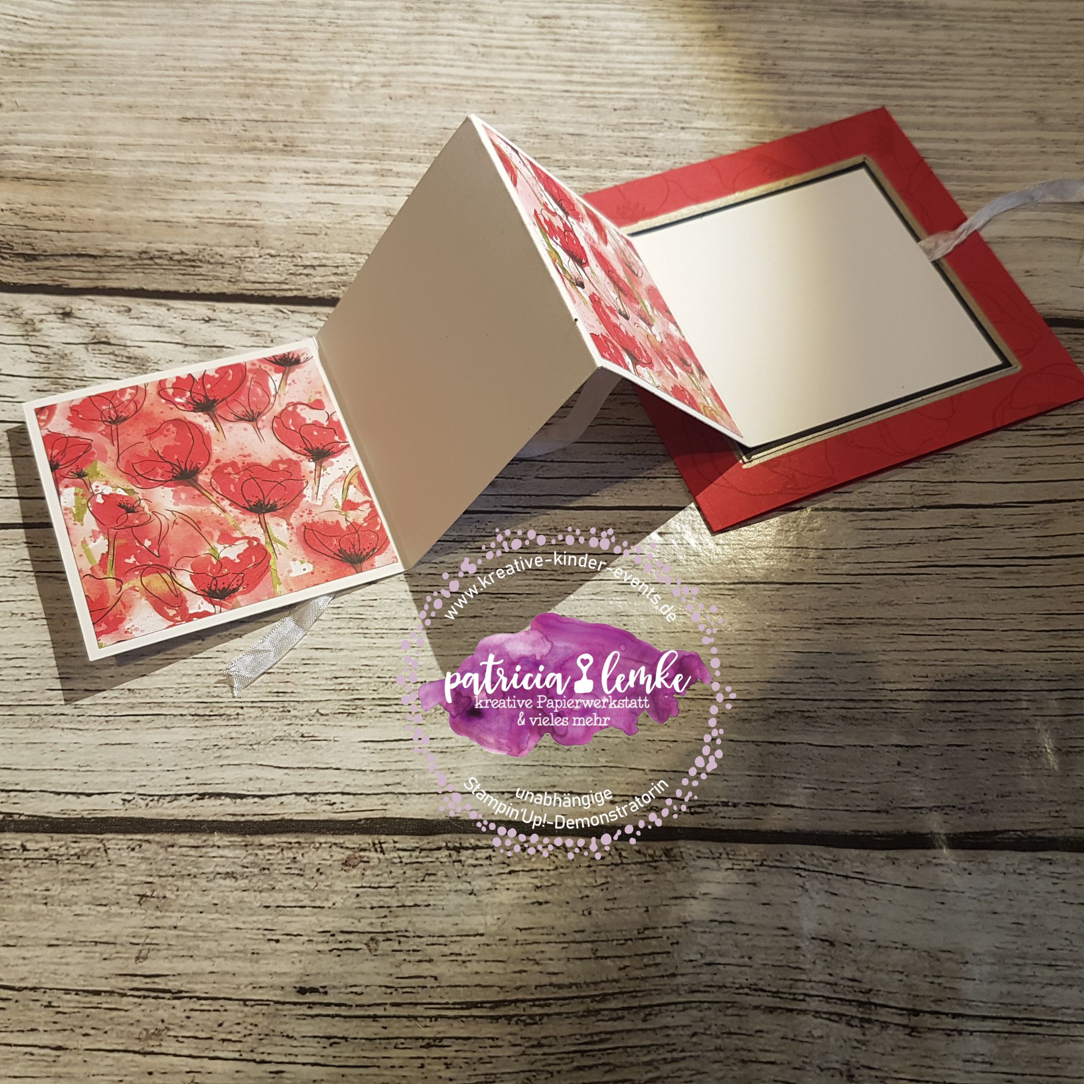 Bei Elisabeth’s Stempelparty kamen ein paar sehr erfahrene Stempelfreundinnen zusammen. Für das gemeinsame kreativ werden hatte ich mir eine Karte im quadratischen Format mit einem Leporello vorne drauf, überlegt. Von Elisabeth hatte ich im Vorfeld erfahren, dass sie sich gern ein Projekt mit dem tollen Stempelset „Painted Poppies“ (das ist das mit den wunderschönen Mohnblüten), wünscht. Hier kannst Du dir die Anleitung speichern. Anleitung für eine quadratische Karte mit Leporello auf der Front