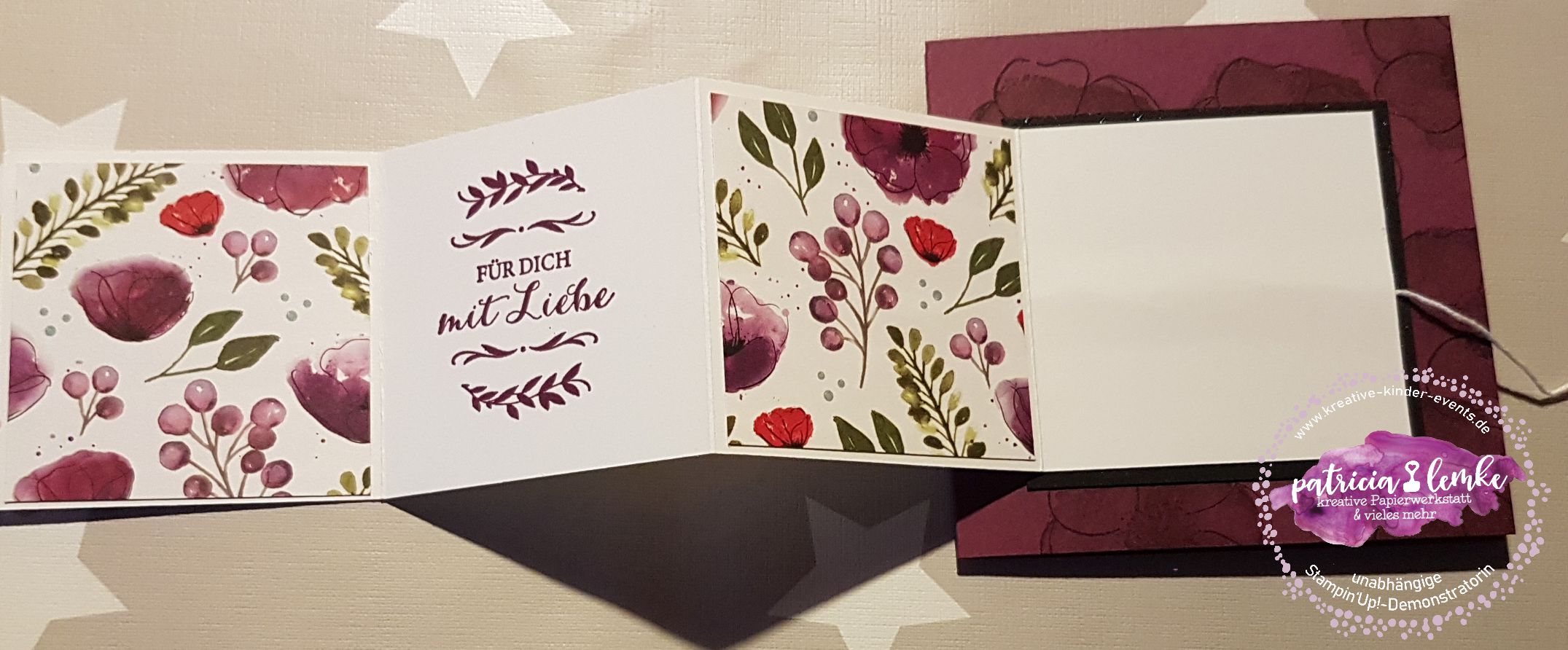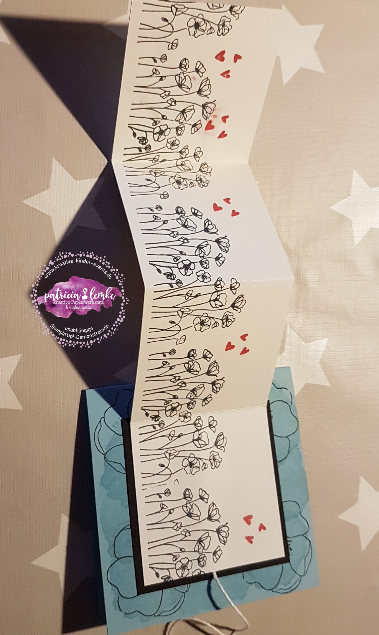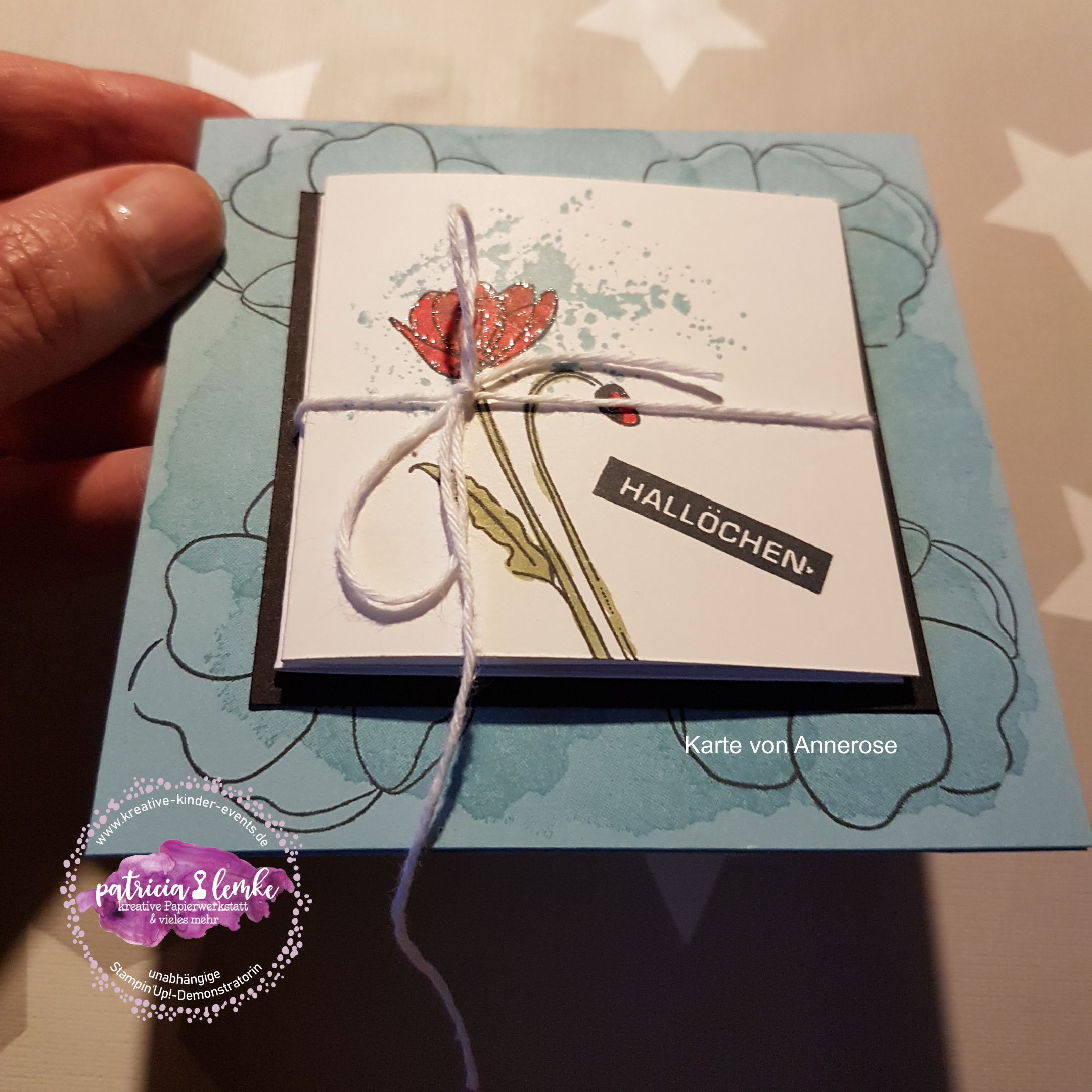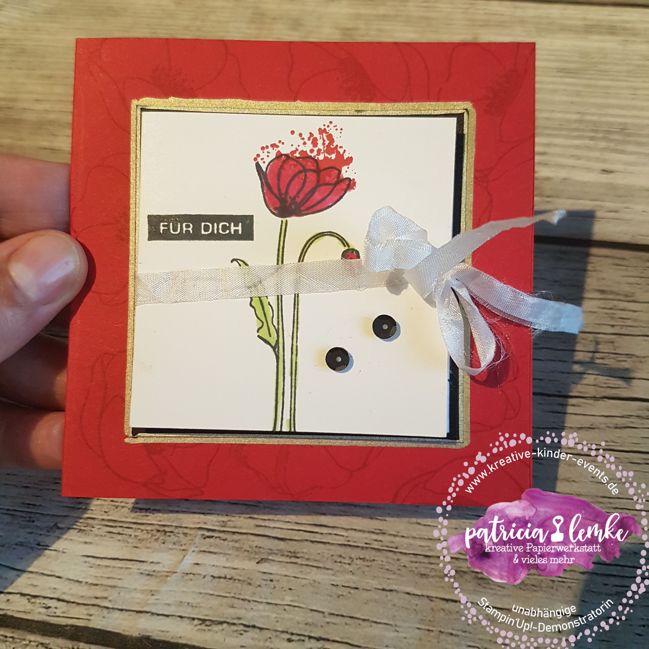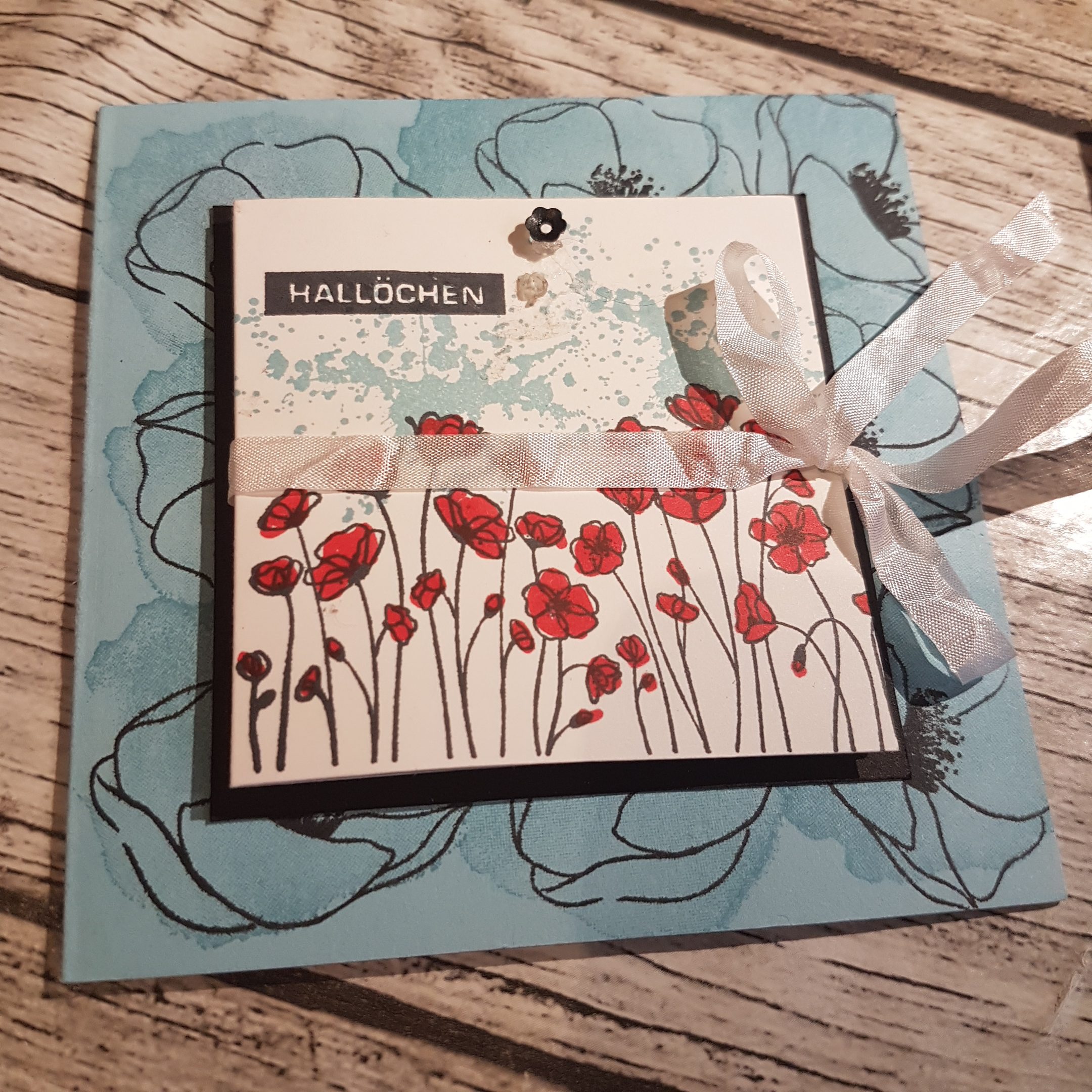 Bei Elisabeth’s Stempelparty kamen ein paar sehr erfahrene Stempelfreundinnen zusammen. Für das gemeinsame kreativ werden hatte ich mir eine Karte im quadratischen Format mit einem Leporello vorne drauf, überlegt. Von Elisabeth hatte ich im Vorfeld erfahren, dass sie sich gern ein Projekt mit dem tollen Stempelset „Painted Poppies“ (das ist das mit den wunderschönen Mohnblüten), wünscht. Hier kannst Du dir die Anleitung speichern. Anleitung für eine quadratische Karte mit Leporello auf der Front