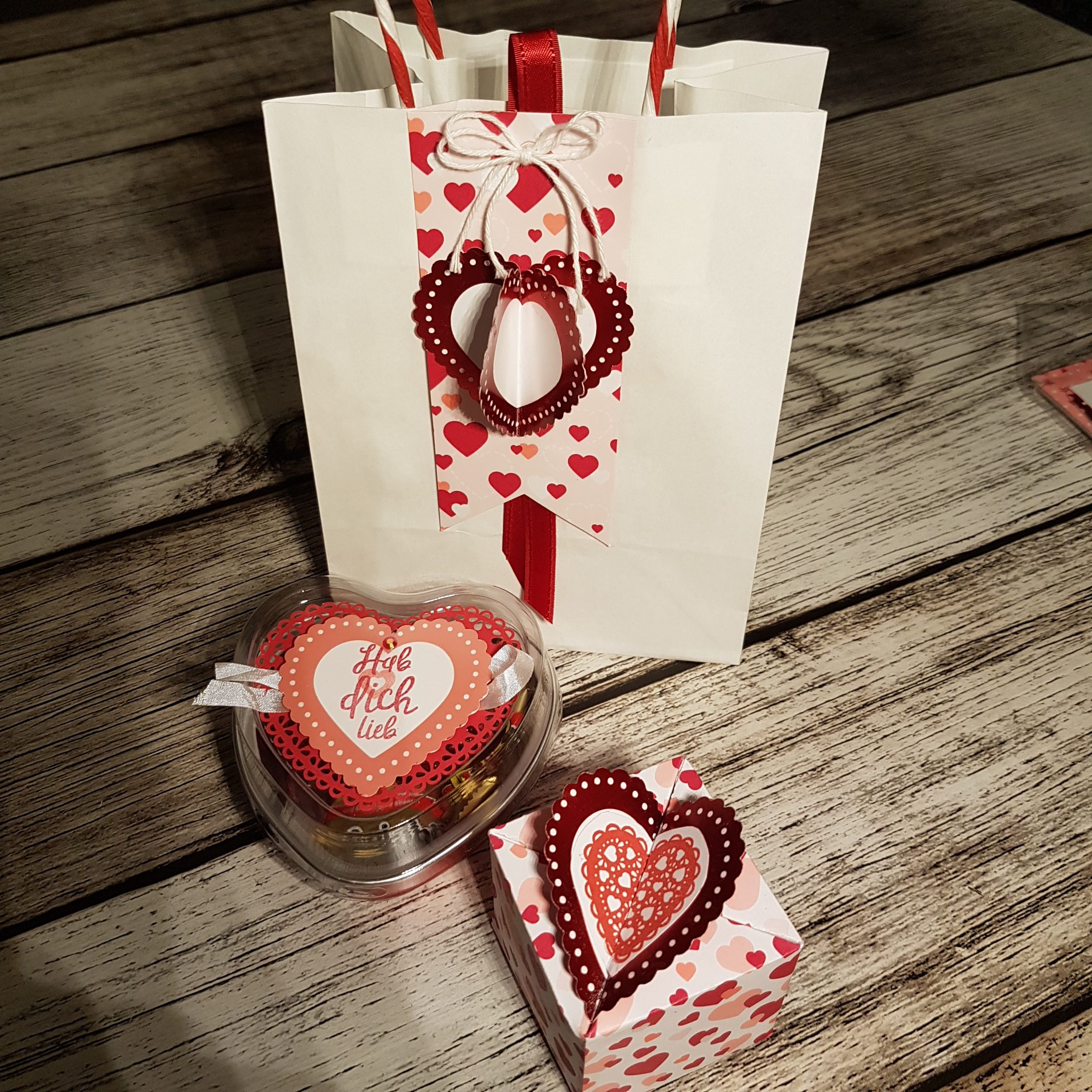 - Mein Geschenk für die Gastgeberin. Für die Teilnehmer hatte ich 1 Metallherzdose gefüllt mit Leckereien.